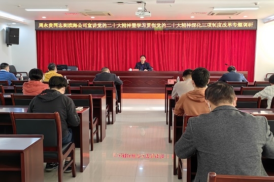12月8日上午,市城投集團(tuán)黨委書記、董事長(zhǎng)周永貴到掛點(diǎn)聯(lián)系的下屬濱海公司宣講黨的二十大精神,并就學(xué)習(xí)貫徹黨的二十大精神深化三項(xiàng)制度改革開展專題調(diào)研。濱海公司全體黨員干部職工參加宣講會(huì)及專題調(diào)研。周永貴結(jié)...