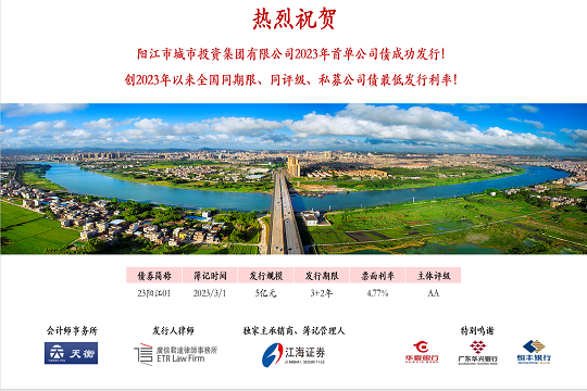 2024年1月19日,市城投集團(tuán)在深圳證券交易所成功發(fā)行“陽(yáng)江市城市投資集團(tuán)有限公司2024年面向?qū)I(yè)投資者非公開發(fā)行公司債券”。本期債券發(fā)行規(guī)模為5.5億元,期限為5(3+2)年,票面利率3.10%,全場(chǎng)認(rèn)購(gòu)倍數(shù)超過(guò)4.8倍,是...